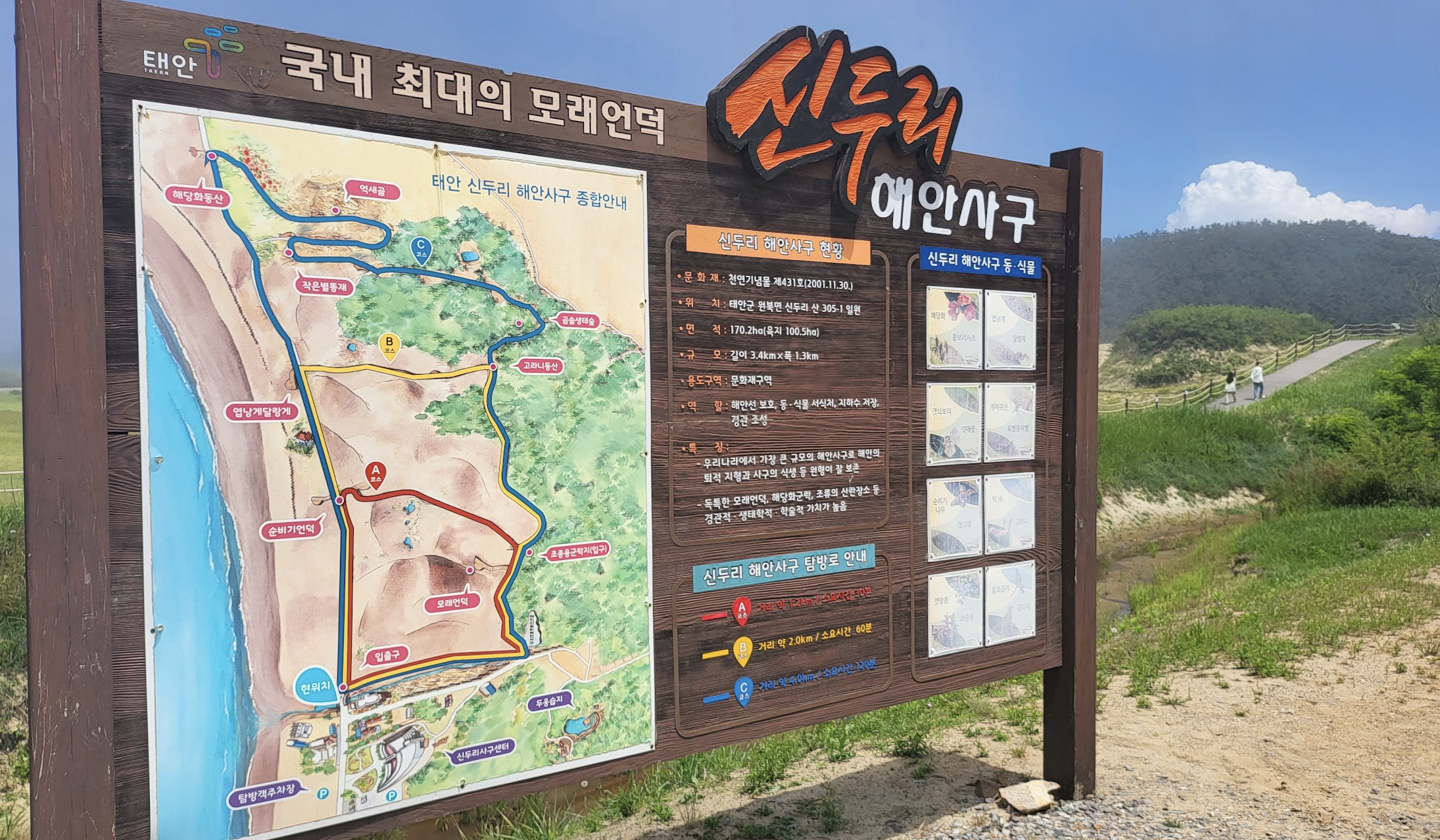 신두리 사구는 세 코스이나 가장 긴 C코스를 시계 반대 방향으로 관람하는 게 좋다. 두 시간 거리라고 하지만 4km라서 남자들은 40분 만에도 돌고 나온다.. 숲쪽으로 돌면서 구경하고 중간 중간 사진찍고, 나올때는 일직선 해안가 바람 맞으며 나오면 되는데...