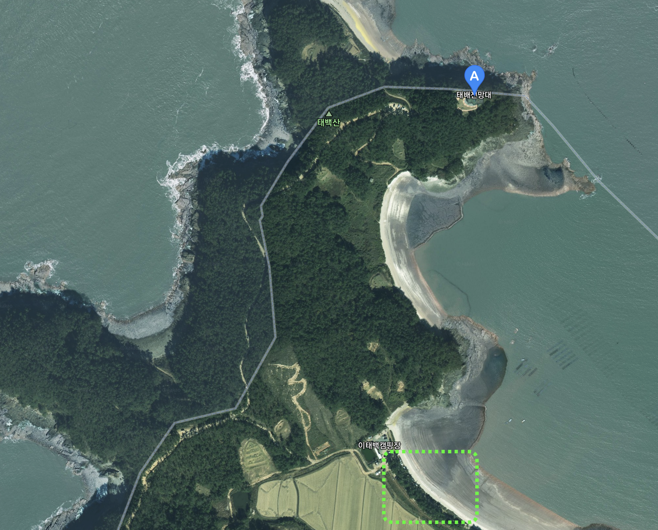 태배전망대 가는 길은 마지막에 비포장길이고 주차장도 따로 없는 듯 하다. 다만 아래 사진에서 보듯 내비찍고 끝까지 가면 이태백 캠핑장이 나오니 거기에 유료로 주차를 하든 그 앞 초록색 박스 길가 (두 대 왕복하기에 충분한 비포장 길) 에 일렬 주차를 하면 된다. 아래 초록색 박스에 주차했는데 송림이 있어 그늘져 아주 시원했음