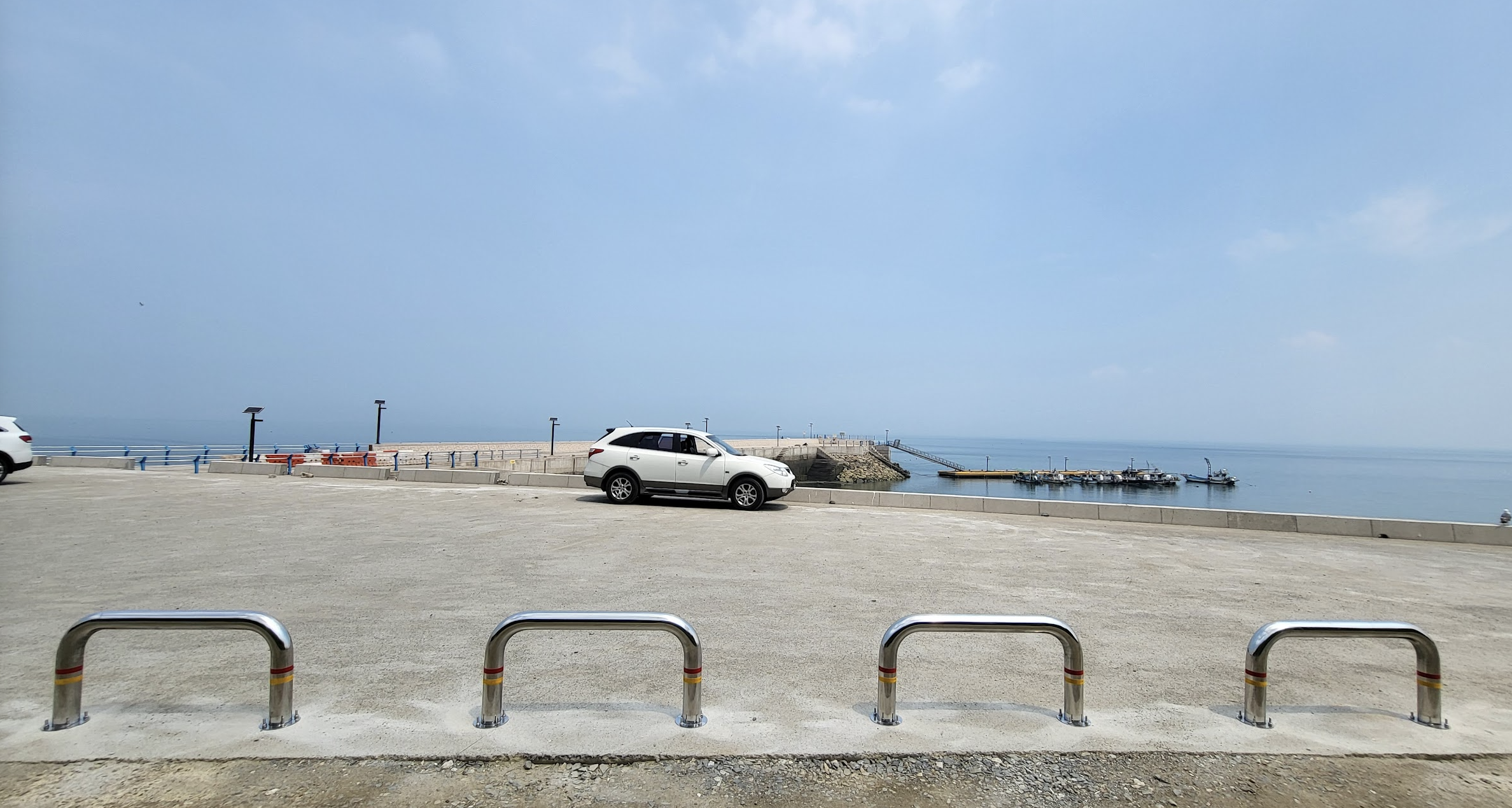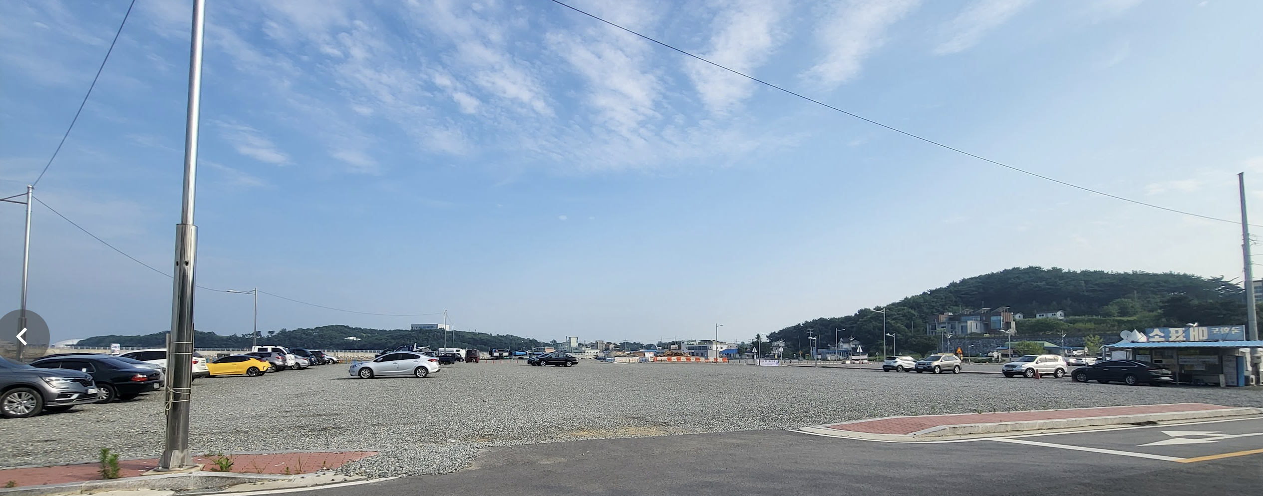 장고항 - 파쇄석 주차장 (화면에서 길 건너에도 이런 공간 또 있음, 곳곳에 캠핑카와 차박 텐트가 이른 시간임에도 펼쳐져 있음)장고항 - 포장된 주차장 (보이지 않는 부분이 더 넓음)장고항 - 주차장 옆 산책로