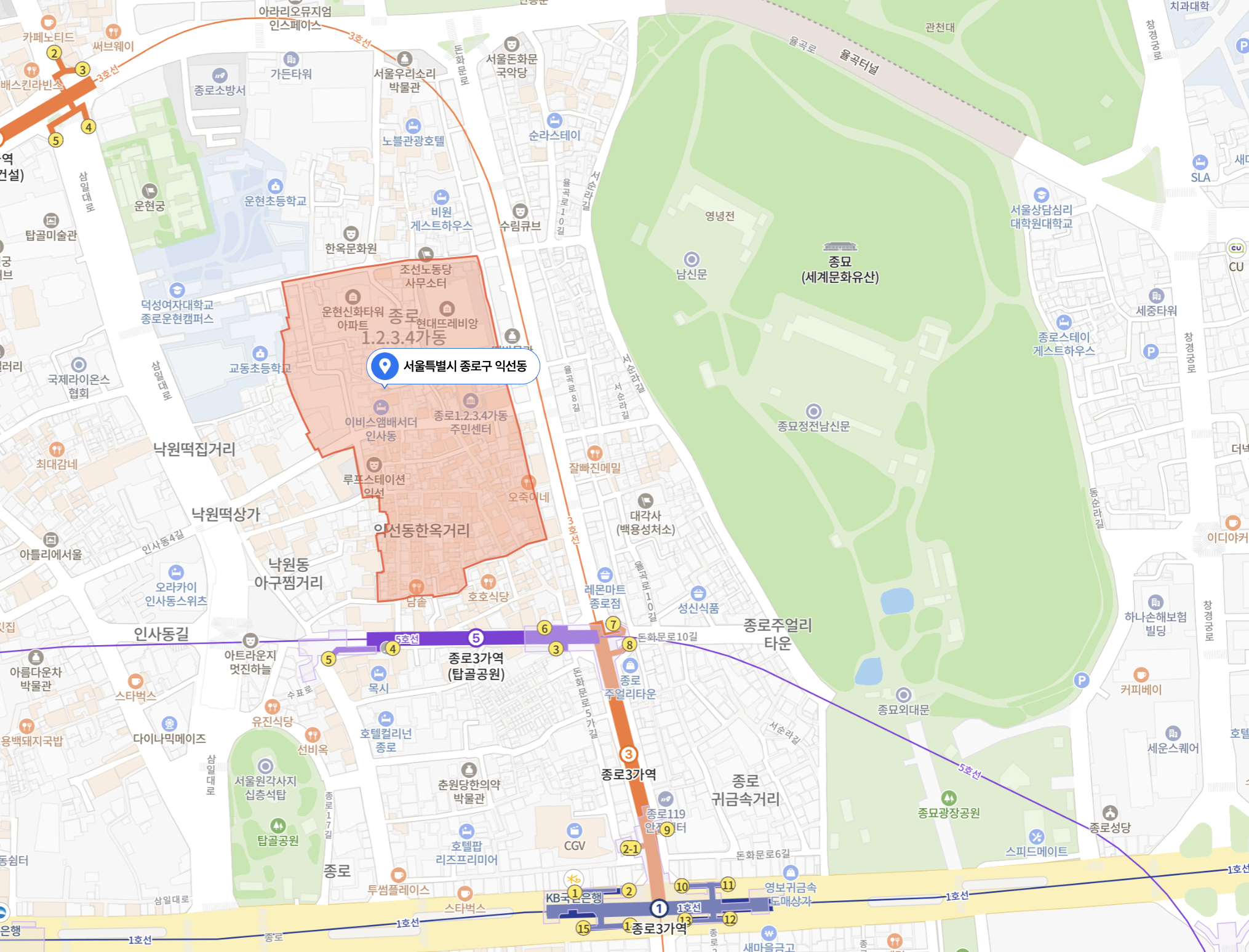 - 종로3가역 11번 출구 ~ 종묘광장공원 ~ 종묘 ~ 익선동 ~ 운현궁 ~ 종로3가역